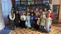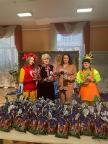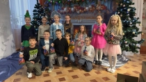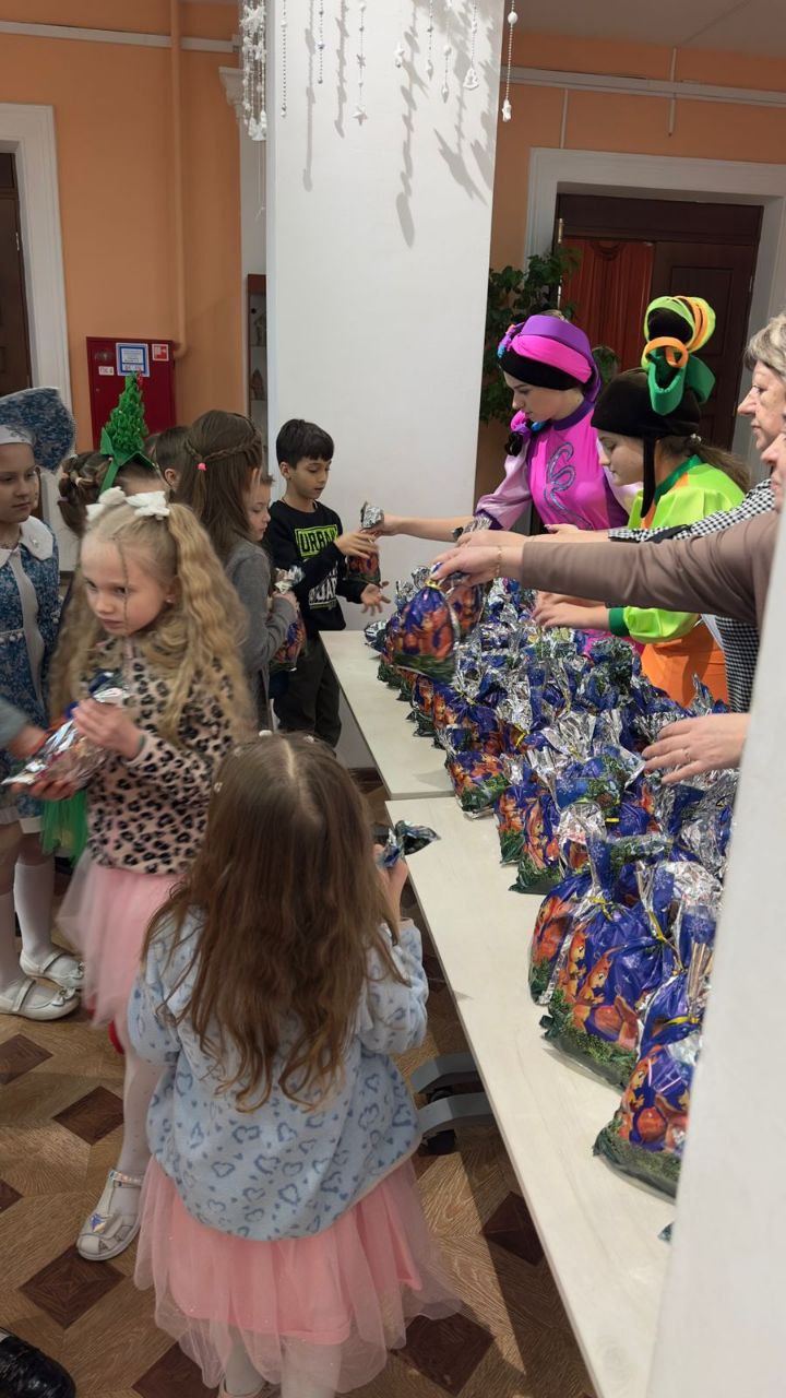 А сказочные герои с Дедом Морозом и Снегурочкой вручили сладкие подарки ребятишкам.